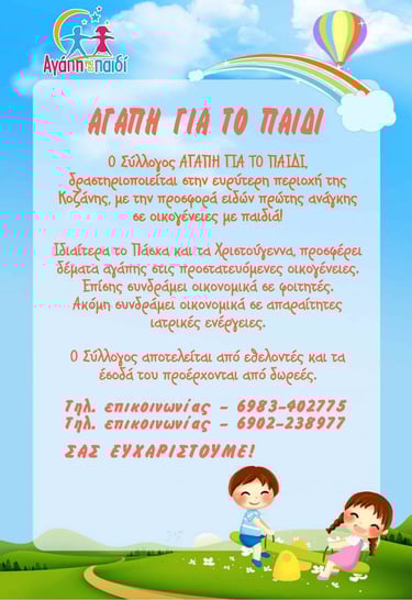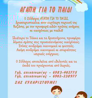 Σύλλογος με έδρα την Κοζάνη που στηρίζει με αγάπη και πράξεις τα παιδιά που έχουν ανάγκη.